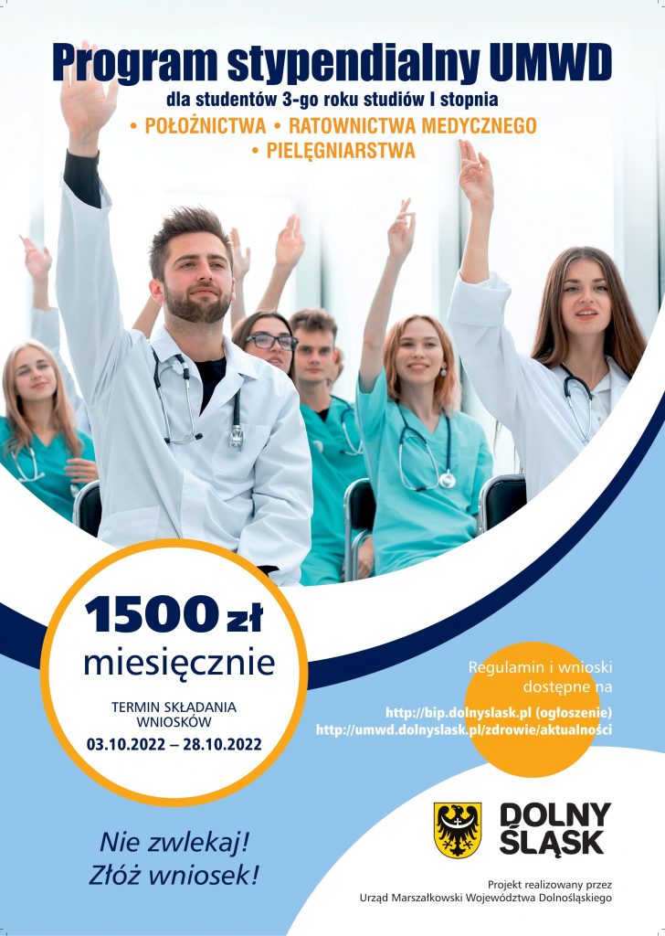 16 września 2022 2 stycznia 2023 Program stypendialny Urzędu Marszałkowskiego Województwa Dolnośląskiego dla studentów 3-go roku studiów I stopnia . Szczegóły: https://umwd.dolnyslask.pl/zdrowie/aktualnosci/artykul/zarzad-wojewodztwa-dolnoslaskiego-oglasza-nabor-wnioskow-o-przyznanie-stypendiow-dla-student-1/ Share the post "Program stypendialny Urzędu Marszałkowskiego Województwa Dolnośląskiego dla studentów 3-go roku studiów I stopnia" FacebookXShare…