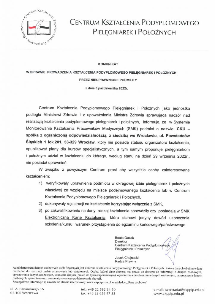 6 października 2022 6 października 2022 UWAGA, Komunikat w sprawie prowadzenia kształcenia podyplomowego pielęgniarek i położnych przez nieuprawnione podmioty Share the post "UWAGA, Komunikat w sprawie prowadzenia kształcenia podyplomowego pielęgniarek i położnych przez nieuprawnione podmioty" FacebookXShare…