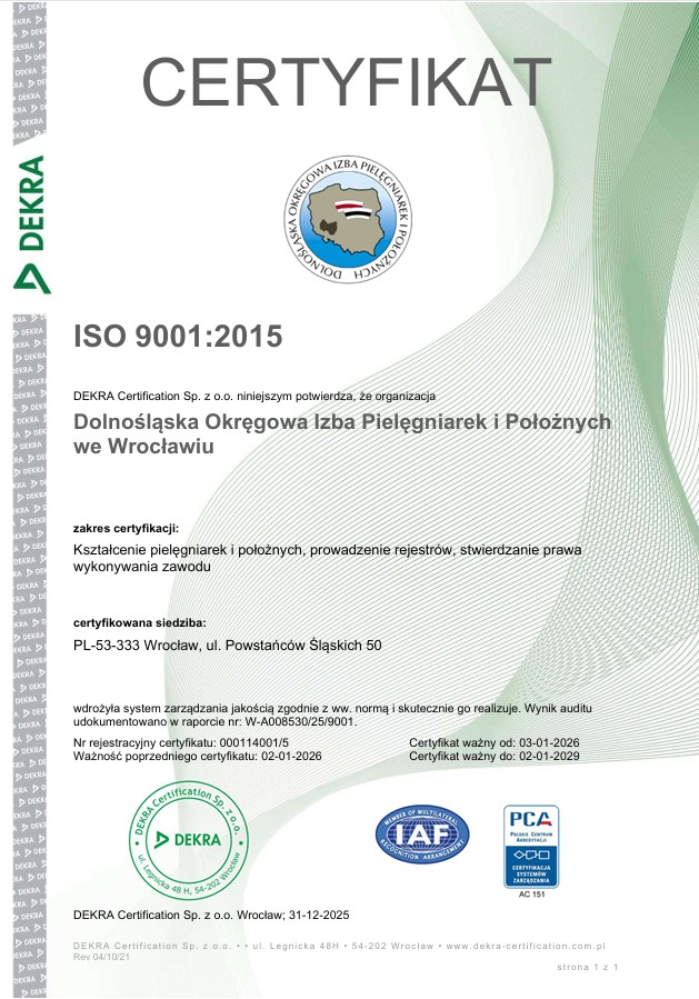 W dniu 20 października 2025 r. w DOIPiP odbył się audyt recertyfikacyjny przeprowadzony przez audytora z niezależnej jednostki certyfikującej DEKRA Certification Sp. z o.o. Celem audytu była weryfikacja zgodności ze standardem PN-EN ISO 9001:2015-10 oraz ocena skuteczności funkcjonowania Systemu Zarządzania Jakością w DOIPiP we Wrocławiu, w obszarach obejmujących m.in. kształcenie pielęgniarek i położnych, prowadzenie rejestrów oraz stwierdzanie prawa wykonywania zawodu.