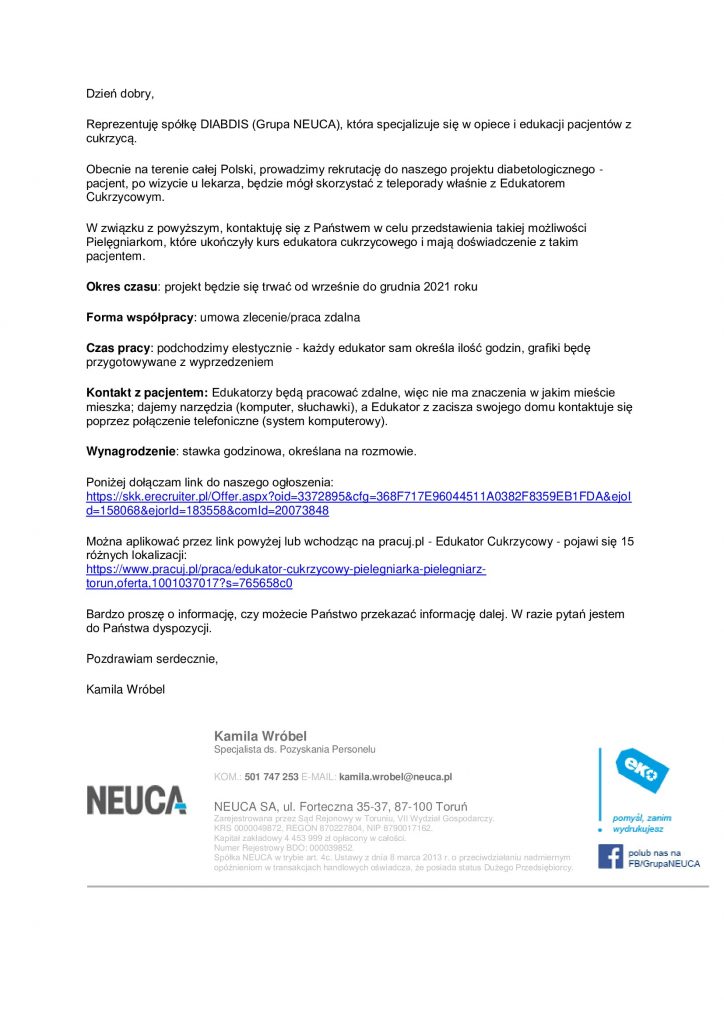 20 lipca 2021 20 lipca 2021 Projekt diabetologiczny dla Edukatorów Cukrzycowych Linki do ogłoszenia : https://skk.erecruiter.pl/Offer.aspx?oid=3372895&cfg=368F717E96044511A0382F8359EB1FDA&ejoId=158068&ejorId=183558&comId=20073848 https://www.pracuj.pl/praca/edukator-cukrzycowy-pielegniarka-pielegniarz-wroclaw,oferta,1001037022?s=75fd4246 Share the post "Projekt diabetologiczny dla Edukatorów Cukrzycowych" FacebookXShare…