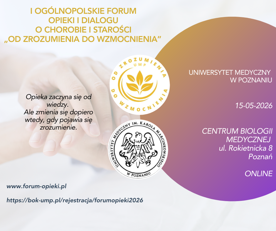 15 maja 2026 r. w Centrum Biologii Medycznej Uniwersytetu Medycznego im. Karola Marcinkowskiego w Poznaniu odbędzie się I Ogólnopolskie Forum Opieki i Dialogu o Chorobie i Starości „Od zrozumienia do wzmocnienia”.